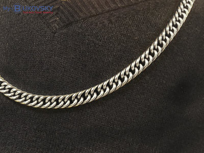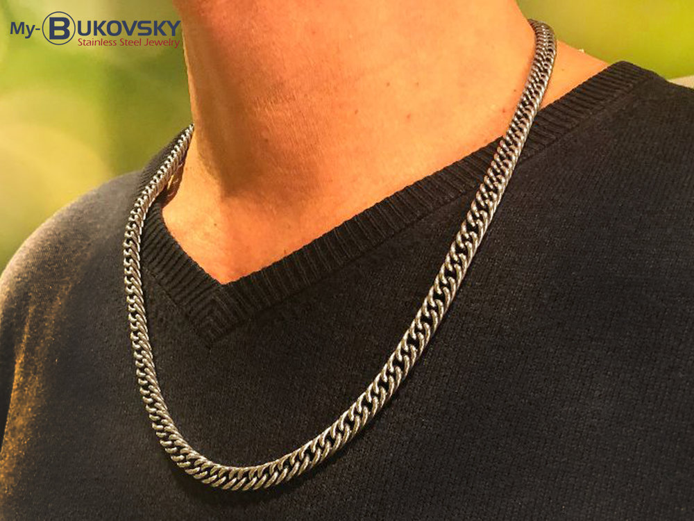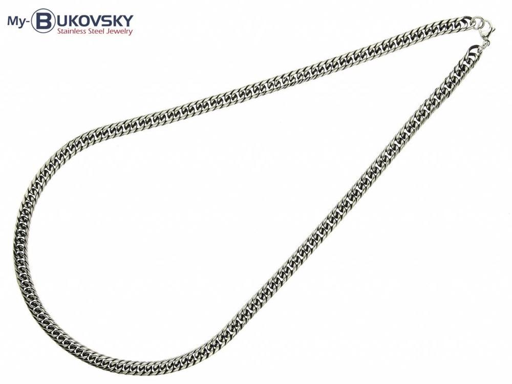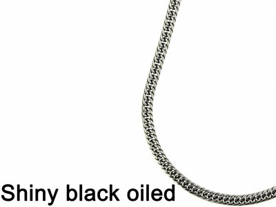 Gepolijste black oiled (glanzend aan de buitenkant en stoer black oiled tussen de schakels) Bukovsky stalen heren ketting. Van massief 316L edelstaal met ronde Gourmette schakels en een luxe karabijnsluiting.