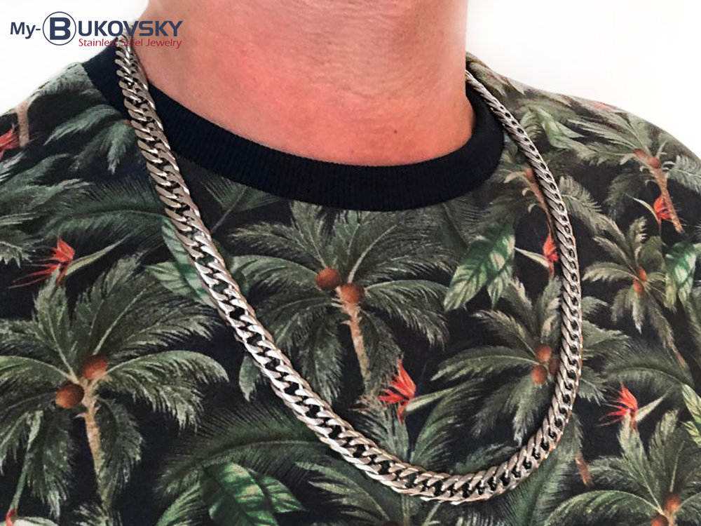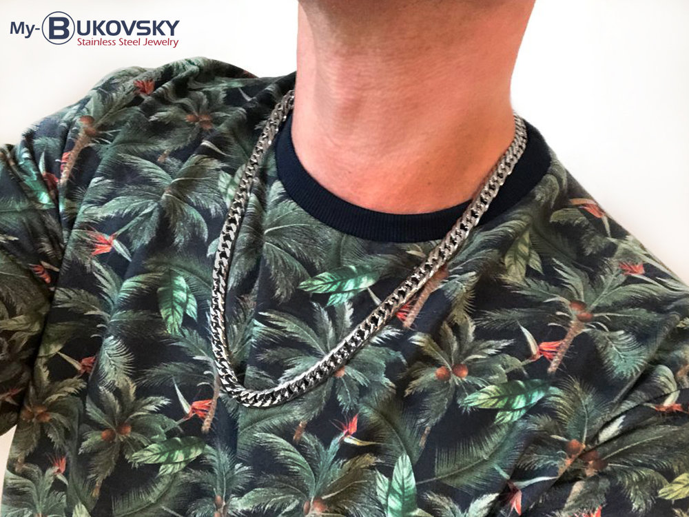 Gepolijste (glanzende) Bukovsky stalen heren ketting. Van massief 316L edelstaal met platte, hoekige Gourmette schakels en een luxe Karabijnsluiting. Verkrijgbaar in 3 lengtematen.