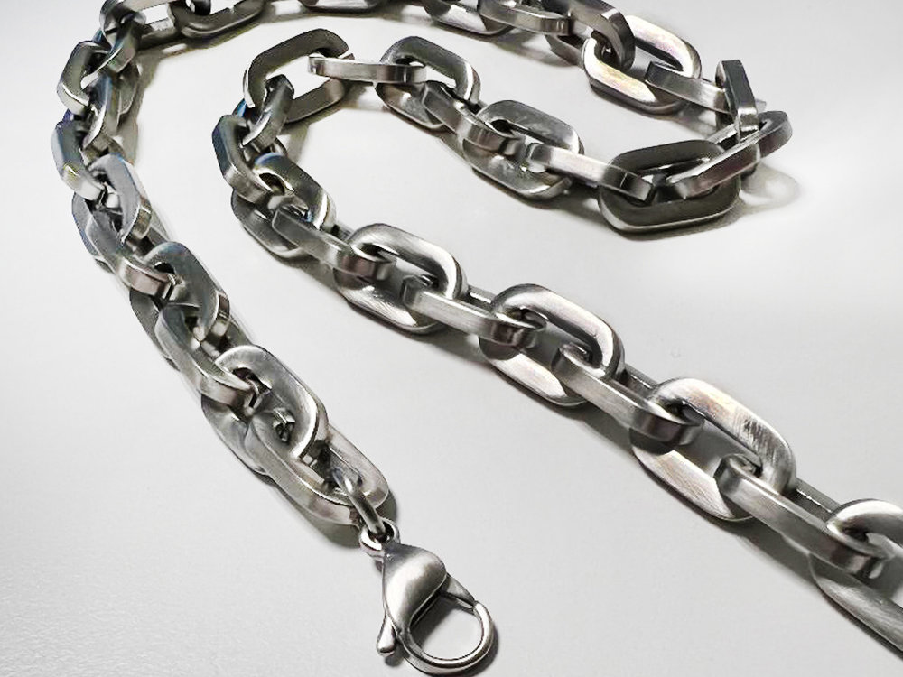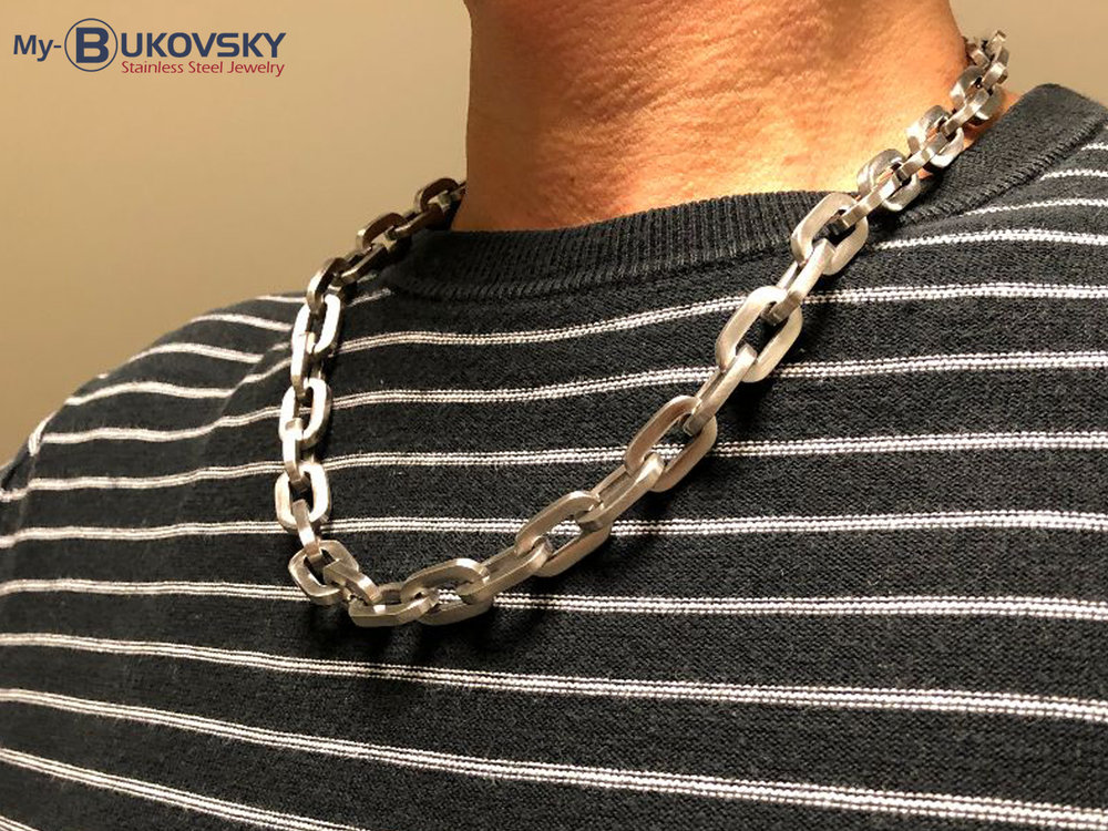 Een unieke, stoer geborstelde/matte Bukovsky stalen heren ketting van massief 316L edelstaal met fantasie schakels en een luxe karabijnsluiting.