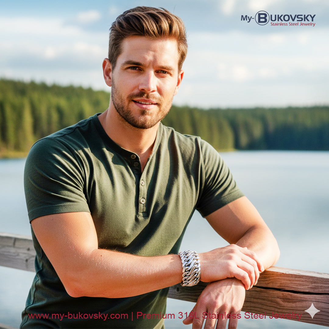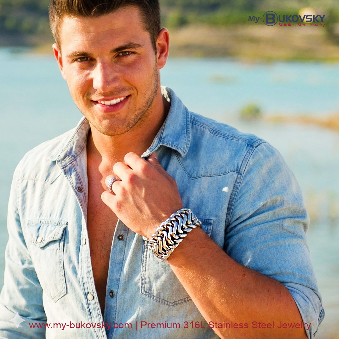 Grandioos, stoer en dé ultieme eyecatcher met een uitstekende prijs-kwaliteitverhouding. De roestvrij stalen heren schakelarmband Bukovsky "Elegance XL". De breedste armband uit onze collectie.
