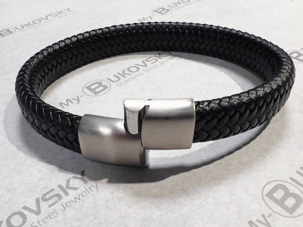 De stoere en toch stijlvolle gevlochten leren Bukovsky armband "SL6550" zwart. Met een geborstelde stalen sluiting.
