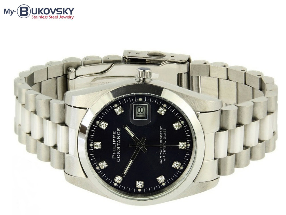 Het horloge is gemaakt van 100% hoogwaardig Stainless Steel en heeft een zwarte wijzerplaat met blanke strass steentjes en een datumaanduiding. Het horloge is zeer goed te combineren met de stalen Bukovsky quote armbandjes.
