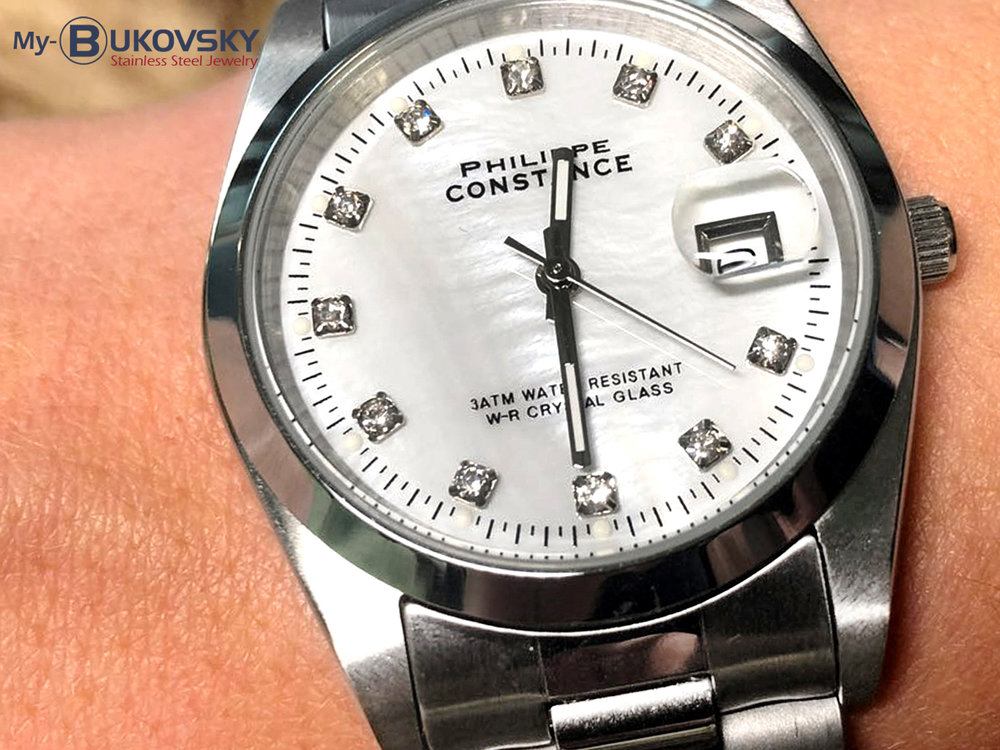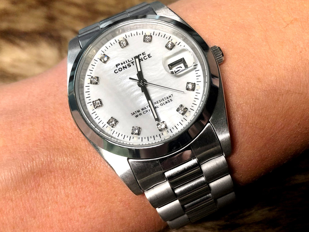 NU 30% KORTING - Philippe Constance Dameshorloge Staal - 4720 Large - Zilver - Parelmoer - Strass - Datumaanduiding - Gratis Verzending