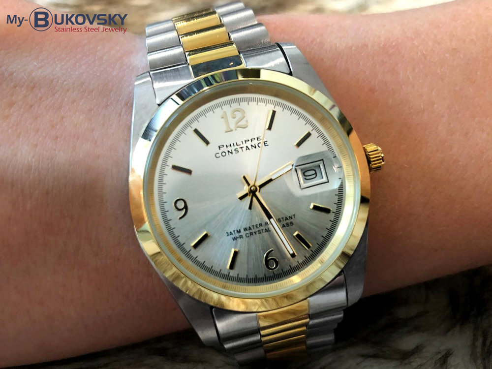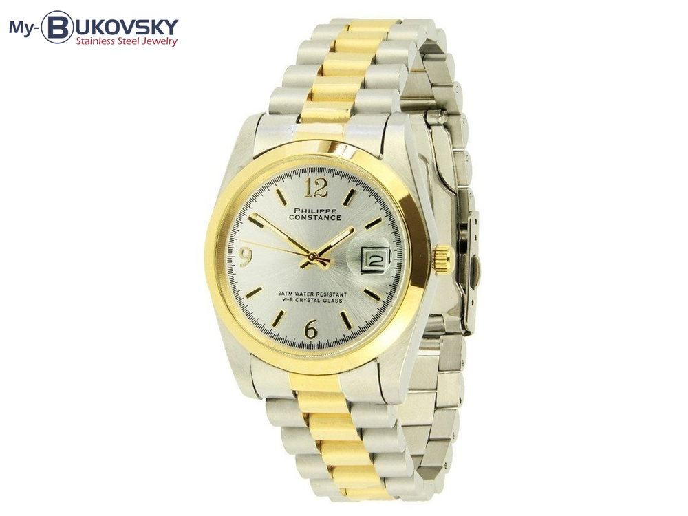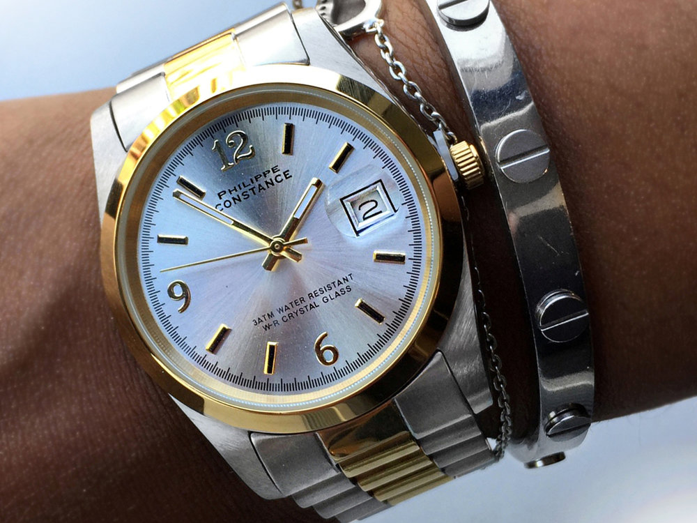 Het iconische Philippe Constance dameshorloge model 2115 Large met stalen bicolor (goud/zilver) schakelband.