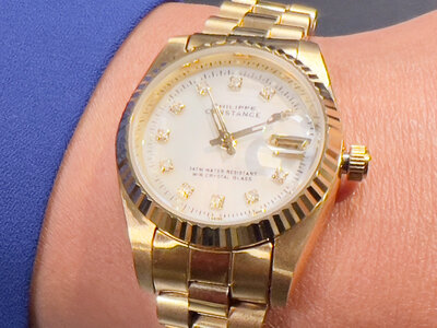Het elegante stalen Philippe Constance dameshorloge, model 6240 Small Deluxe. Goudkleurig, parelmoer wijzerplaat en met blanke strass steentjes.