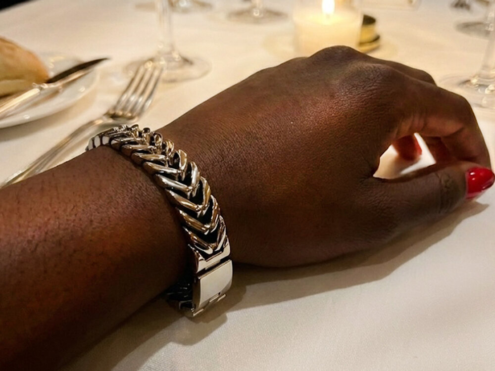 Stoer met een krachtig design. Opvallend maar zeker niet te overheersend. De gepolijste armband "Elite" met vrij grove schakels is een absolute eyecatcher.
