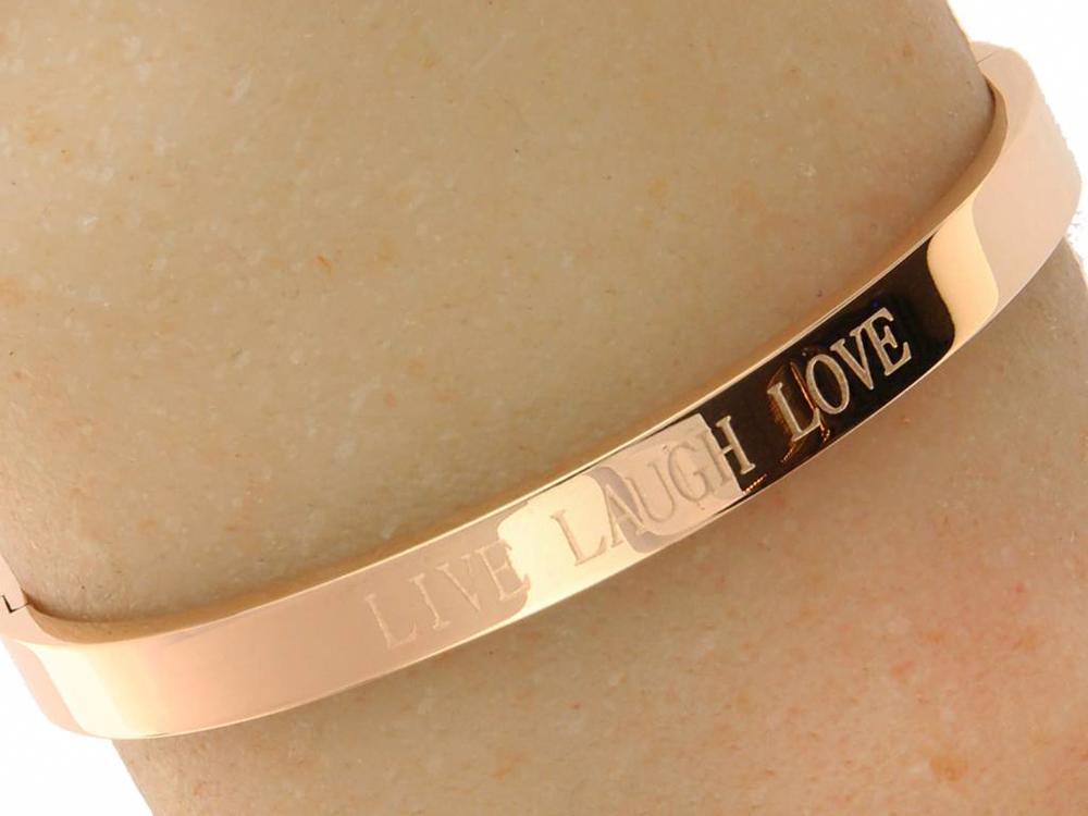 Shine Bright... De stalen Dames Quote Armband "Live Laugh Love" met gepolijste roséplating.