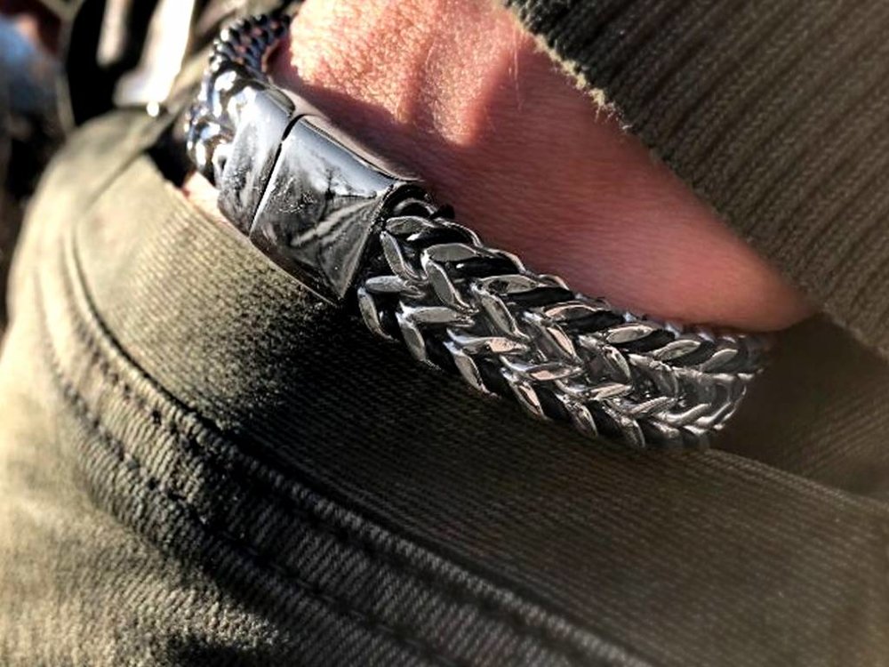 De armband kenmerkt zich door een vrij gesloten schakel structuur. De platte "visgraat" schakels vallen dicht tegen elkaar aan. De armband is aan beide kanten voorzien van een zwart gevlochten koordje voor een unieke en sublieme uitstraling. De armband valt soepel om je pols en heeft een luxe en sterke insteek/magneetsluiting.