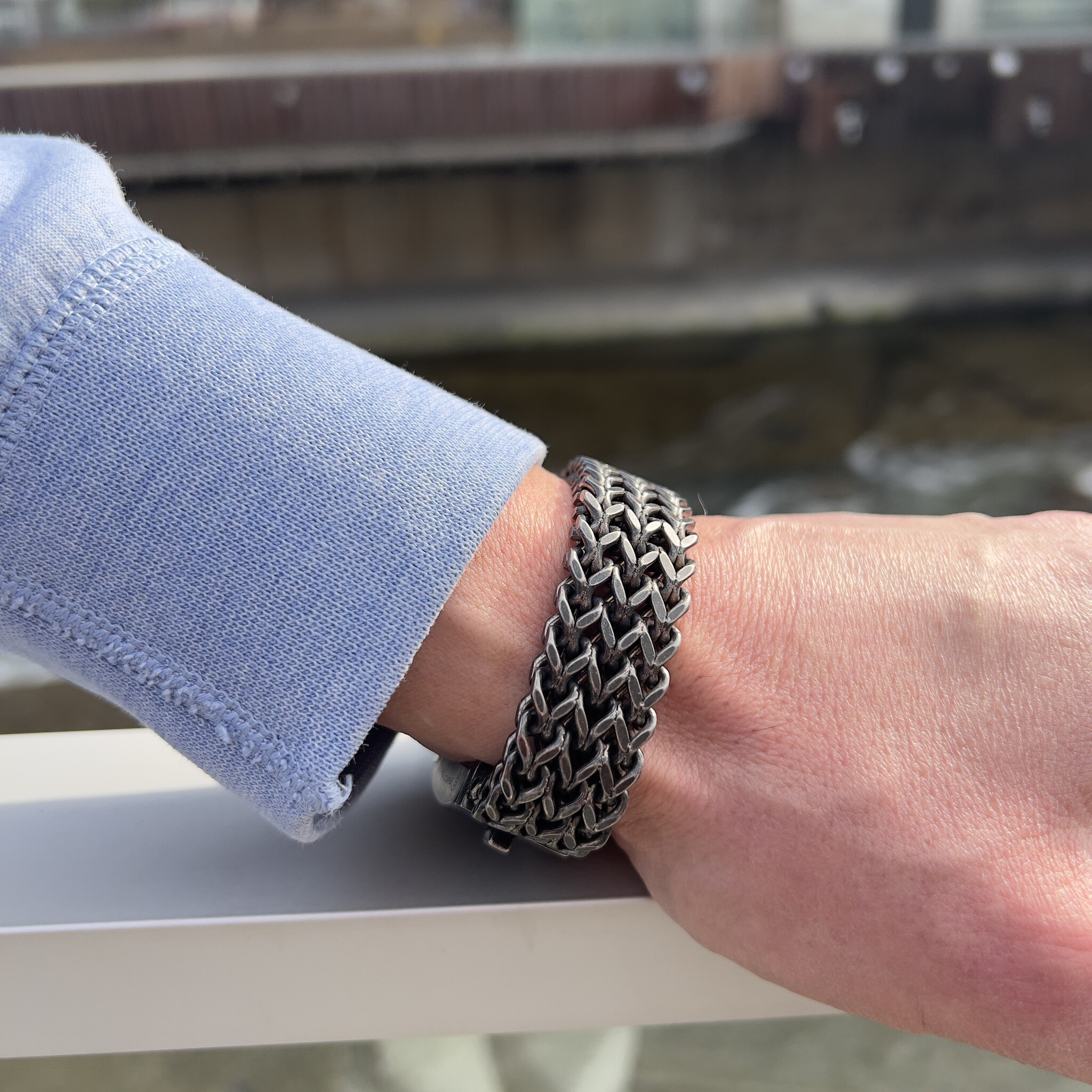 De armband kenmerkt zich door een vrij gesloten schakel structuur. De platte "visgraat" schakels vallen dicht tegen elkaar aan. De armband valt soepel om je pols en heeft een luxe en sterke insteek/plaatsluiting, ook wel een baksluiting genoemd. (Schuif en klik)