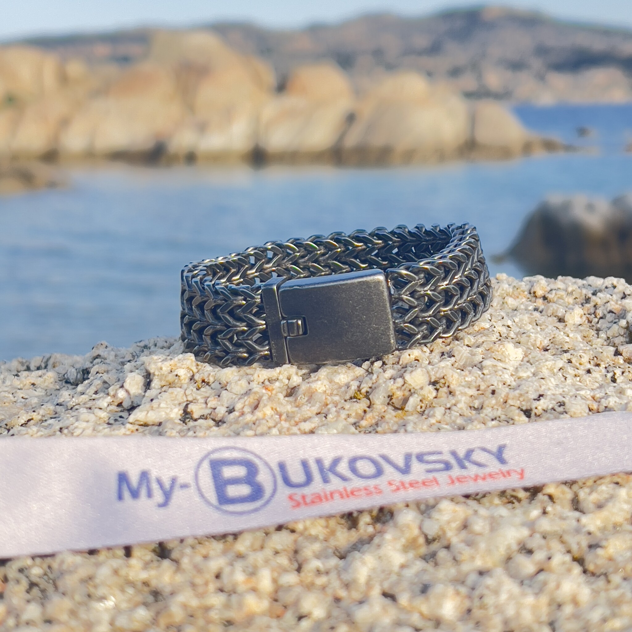 Stoer en sensationeel. Durf jij hem aan? Dan is deze stalen Black Oiled Bukovsky heren armband "Excellent Small" wellicht iets voor jou.