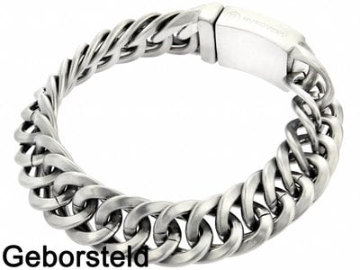 De gematteerde heren armband kenmerkt zich door een vrij gesloten schakelstructuur. De ronde Gourmette schakels vallen dicht tegen elkaar aan. De heren schakelarmband valt soepel om de pols en heeft een luxe en sterke insteek/plaatsluiting ook wel een baksluiting genoemd. (Schuif en klik). Stijlvol en fameus, steel de show met deze stoere schakelarmband.